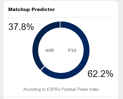 Oddly the ESPN Indicator moved in our favor since yesterday. I think it was closer to 55/45. It must have something to do with quality wins and is almost useless at this point. But I'm feeling 60/40 is closer to right than 55/45. At this point Auburn is an unknown. Maybe the Whiteout and Gameday moved it 😎