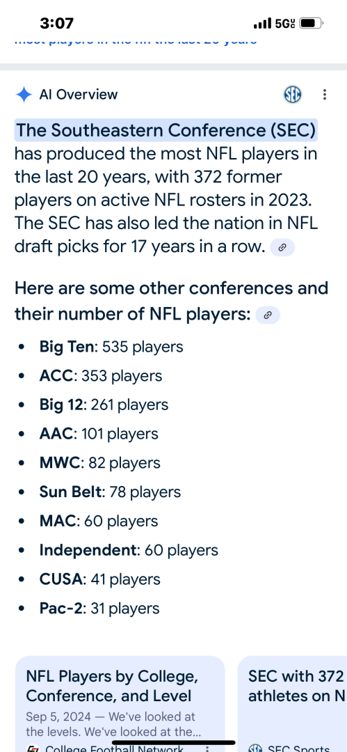 You're changing the argument Southern, just admit you were wrong and move on. You stated that the SEC is "dominating" other conferences IN NFL PLAYERS. You were wrong. They have 550, and the Big Ten has 525. In no world is that dominating anyone. You said the South is dominating rosters, yet Penn State, Ohio State, Michigan, Washington, and Notre Dame are all in the top ten teams for placing NFL players. All of those are northern schools, and that's half of the top ten.It’s not even debatable homer the SEC has dominated the last 25 years. How can you argue with this and you say I’m full of shit 😂 believe what your eyes is showing you because it’s true. You can go look it up I got that off the ncaa stats.
