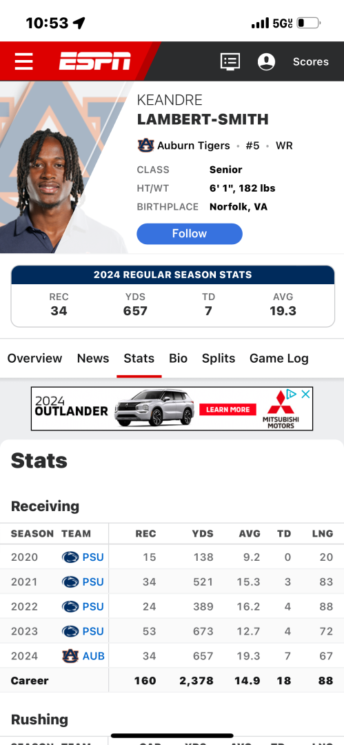 1. KLS has less receptions this year than he had last year, he isnt getting open more. He's racking up yardage in passing situations when his team is losing. So you're wrong. Auburn is 3-6.@roaminglion KLS is gettin open something he supposedly couldn’t do at Penn St last year. He got open with Clifford as well his numbers dropped when DA was throwing to him. The stats are there for you roam