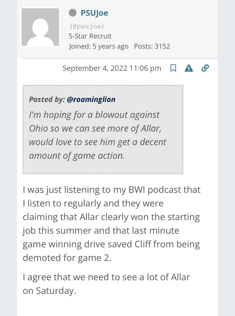 I don't know if I can agree with what you're saying. I tend to feel kinda like what FD says. Drew nedes to "take off the diaper and grow a set". It's time for Allar to play like his pr sheet & NIL $$$'s command. The time for "cleaning things up" & "learning from mistakes" is largely over. It's now or never for him to fulfill his potential and get 'er done. Great potential has benched many players and got quite a few coaches fired.